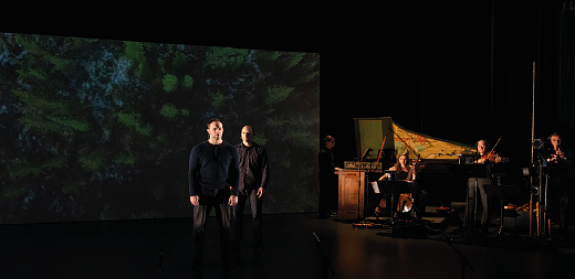 Concert, la proposition l’est également avec l’intégration d’une trame musicale baroque, sorte de contrepoint poétique au réel. Le répertoire baroque, avec sa rhétorique qui lui est propre, offre un espace intérieur et secret, propice à la contemplation et qui évoque le sacré — le sacré de la forêt et du territoire.