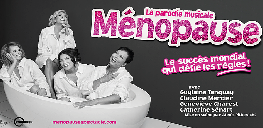 La célèbre parodie musicale Ménopause arrive pour la toute première fois au Québec! À l’affiche depuis plus de 15 ans à Las Vegas, triomphant à Paris depuis 2 ans et ayant été applaudi par près de 17 millions de personnes dans 16 pays, ce spectacle festif pose un regard hilarant et sincère sur ce que les femmes vivent lorsqu’elles traversent la ménopause. Mettant en vedette les talentueuses Guylaine Tanguay, Claudine Mercier, Geneviève Charest et Catherine Sénart dans une mise en scène de Alexis Pitkevicht, Ménopause, la parodie musicale vous fera rire aux éclats, mais aussi chanter et danser sur des parodies de grands succès musicaux anglophones des années 60, 70 et 80 que vous adorez et dont l’adaptation francophone humoristique est signée par la prolifique Danièle Lorain.